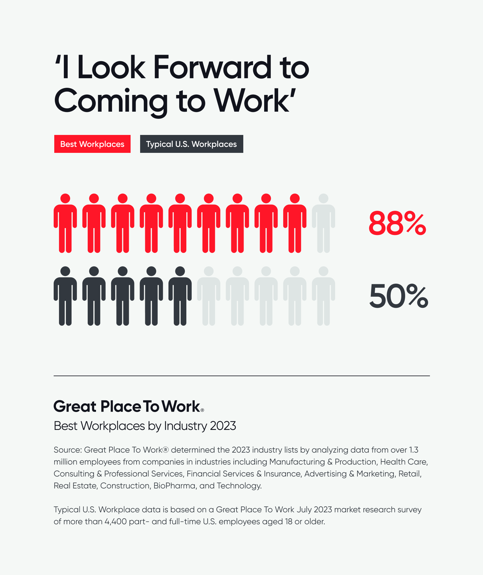 Great Place To Work selected the Best Workplaces for each of the 11 industries in 2023 based on feedback collected from more than 1.3 million employee responses from qualifying Great Place To Work Certified organizations in the United States. Company rankings are derived from 60 employee experience questions within the Great Place to Work Trust Index™ survey.